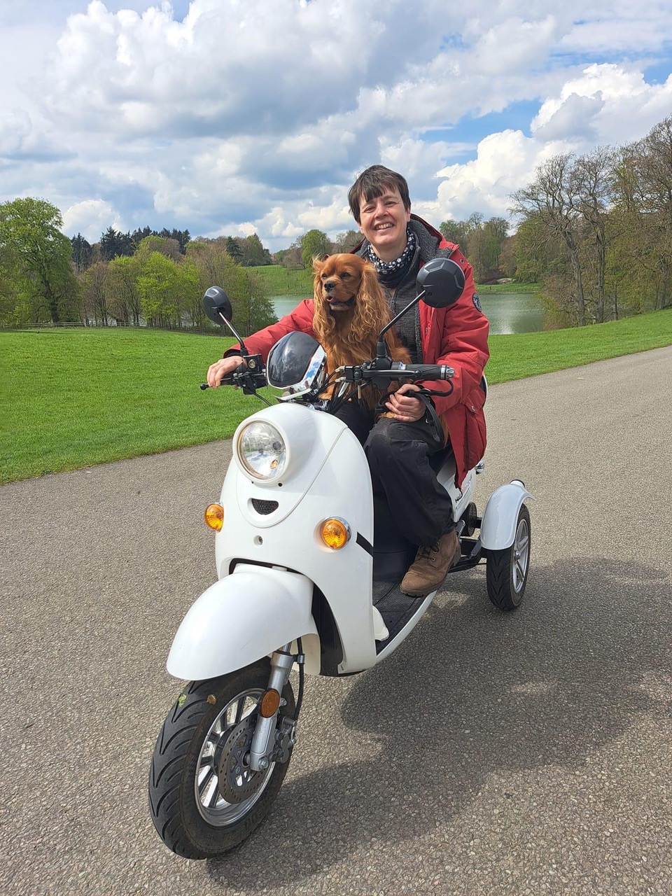 This is Tracey, enjoying getting out and about on her scooter with her dog Billy. Getting outdoors and having fun is such a vital part of recovery and is often one of the first goals I help clients to work towards.